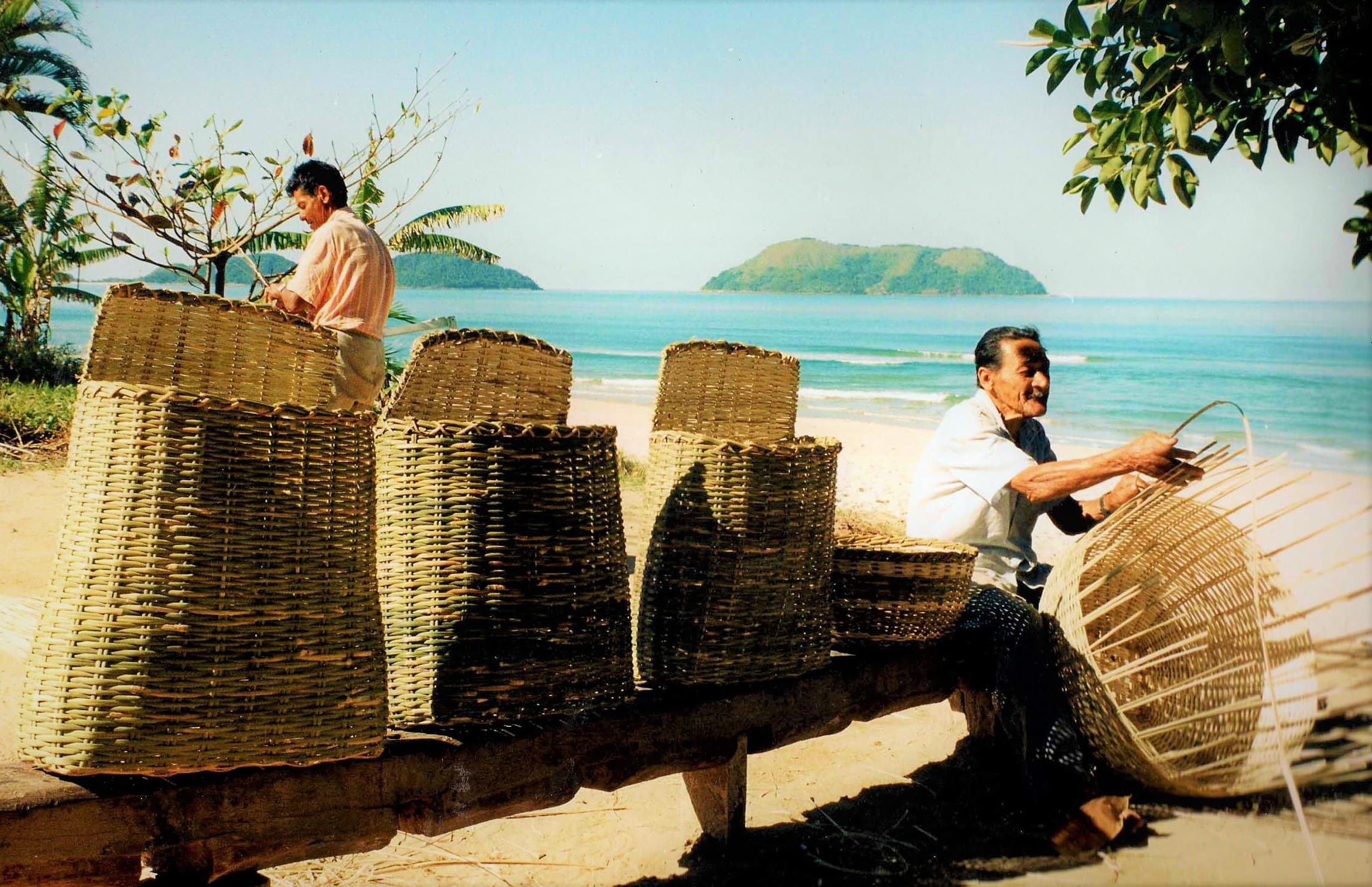 Cestos de palha na praia em Juquehy. Sem data (Foto: São Sebastião Tem Alma).